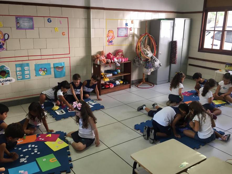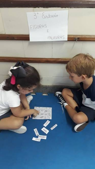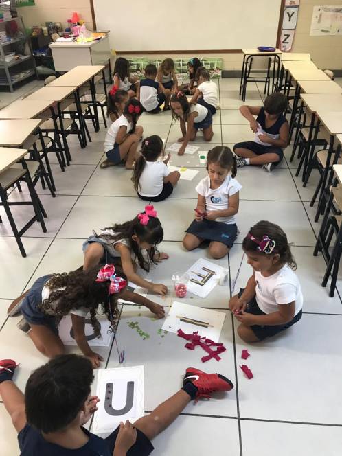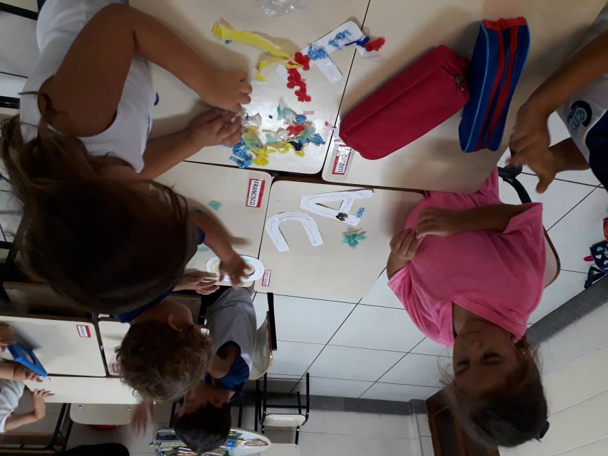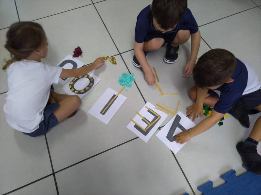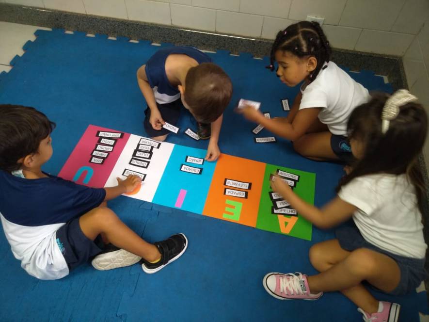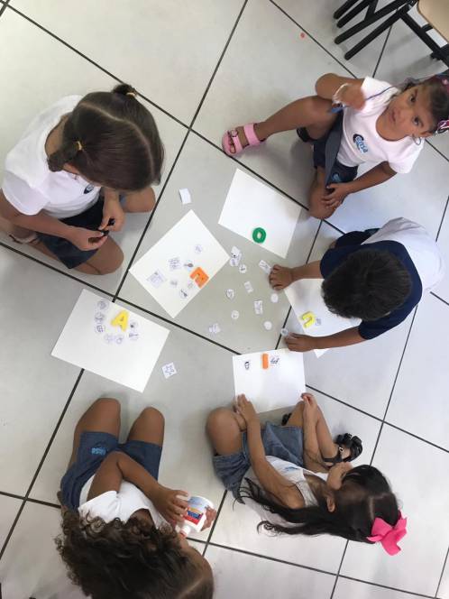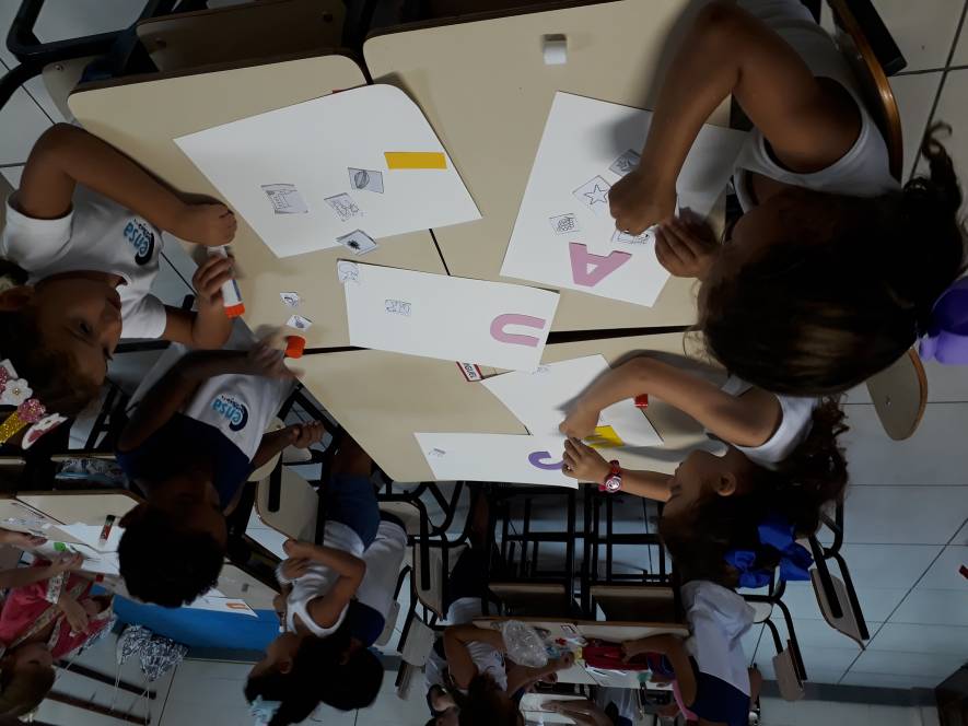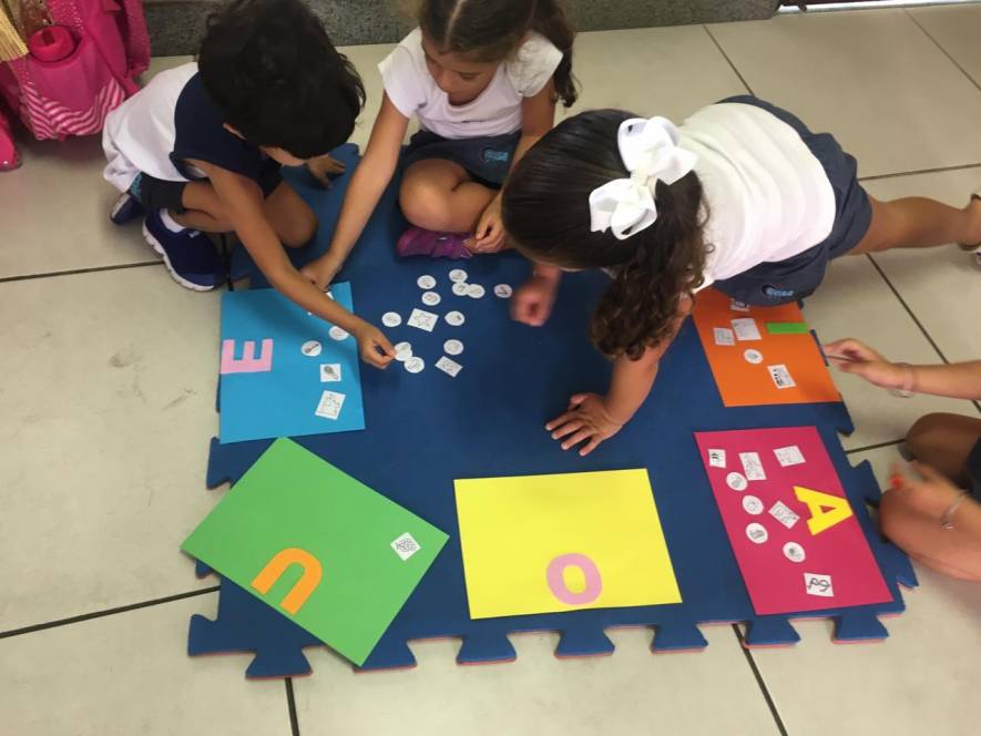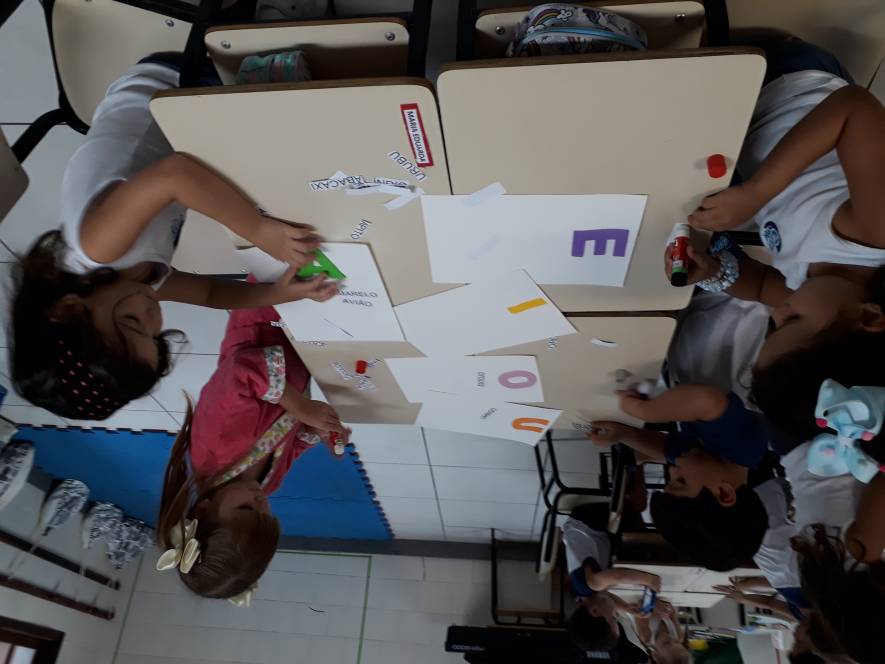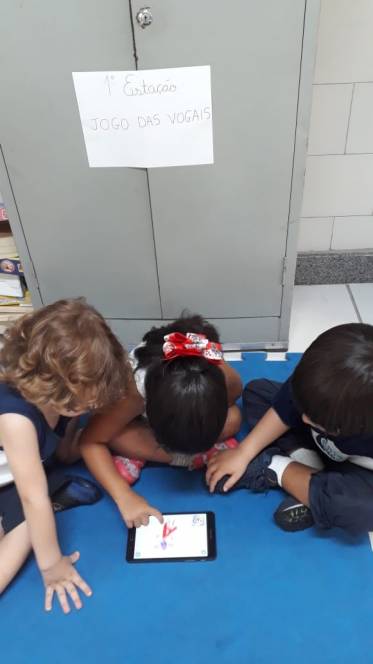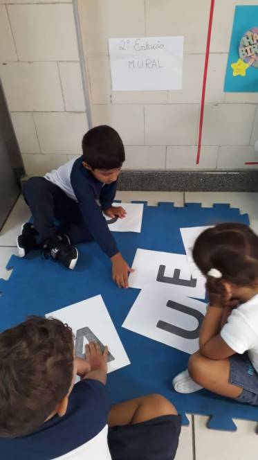 A sequência de atividade foi organizada em quatro estações, através das quais grupos de 3 crianças deveriam experimentar de diversas maneira o conhecimento acerca das vogais.
