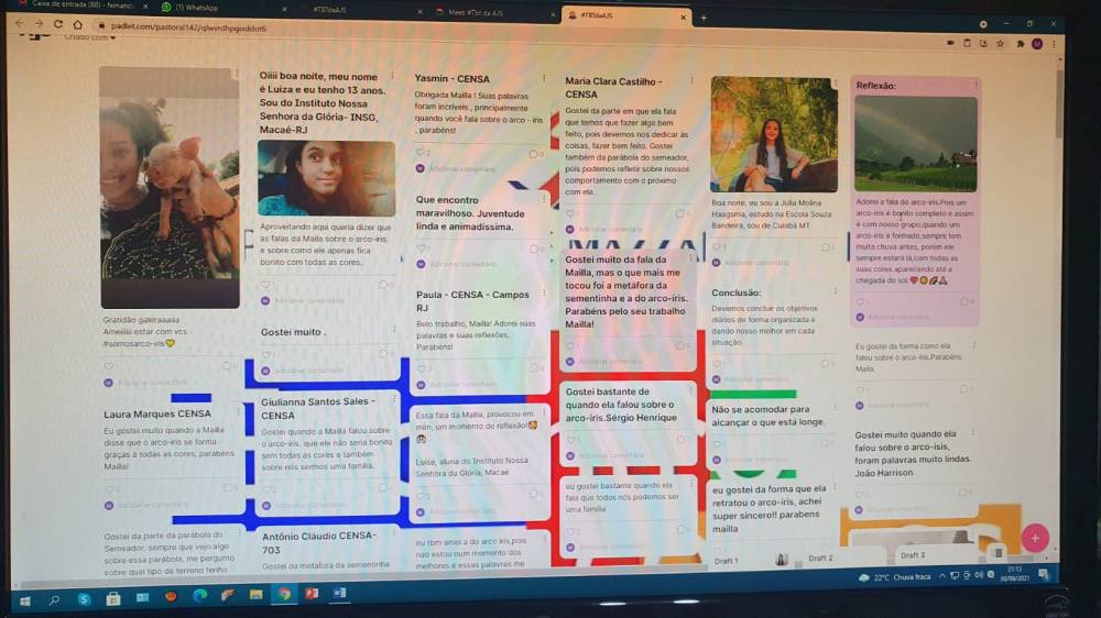 O CENSA participou do Encontro para Adolescentes, na quinta-feira, 30 de setembro. Pela primeira vez online, o evento foi promovido pela Inspetoria Madre Mazzarello, reunindo cerca de 250 jovens sob o comando da Equipe de Coordenação da Articulação da Juventude Salesiana. O Auxiliadora foi representado por 13 alunos, dos 7º e 8º anos, e pelas coordenadoras de Pastoral, Simone Aquino e Fátima Coelho. Ir. Vânia Oreda, coordenadora da Pastoral da Inspetoria deu as boas vindas pedindo que os participantes deixassem a câmera aberta. "Isso deixou o encontro ainda mais alegre e participativo", disse Simone. Música, oração, reflexão, a Palavra apresentada num desenho animado (o semeador) e a palestra dA Mailla Louzada, Coordenadora de Pastoral da Inspetoria Nossa Senhora Aparecida/SP, com o tema “Pouco com Deus é muito e o muito sem Deus é nada”, fizeram parte da programação. Larissa Cristina, uma das coordenadoras da AJS, deu seu testemunho, explicando o sentido do movimento e motivando os jovens a assumirem-se parte da "juventude salesiana".