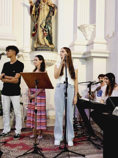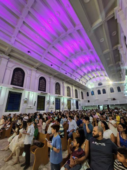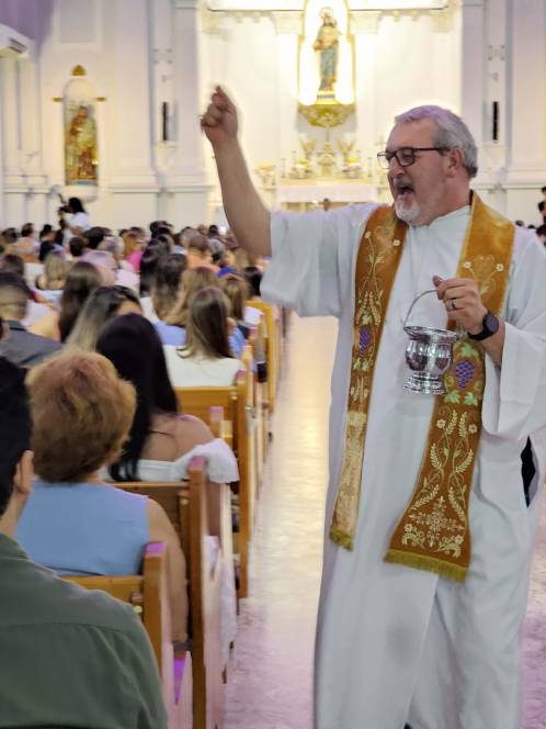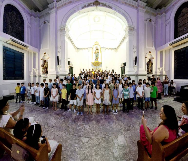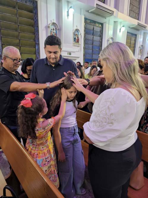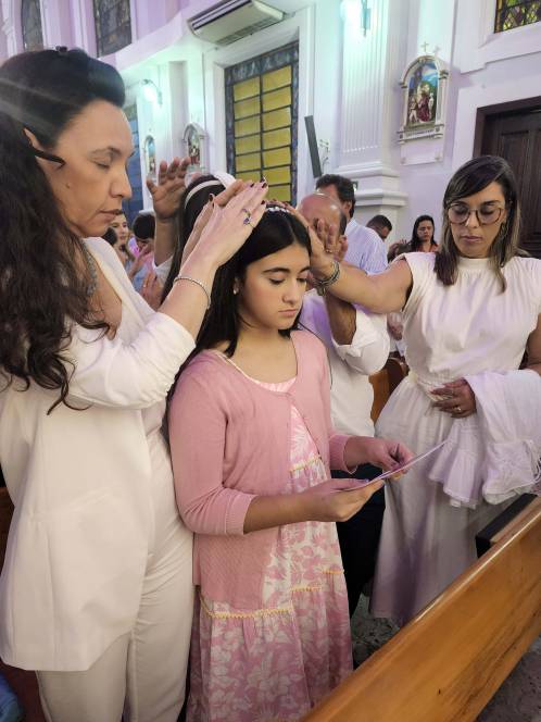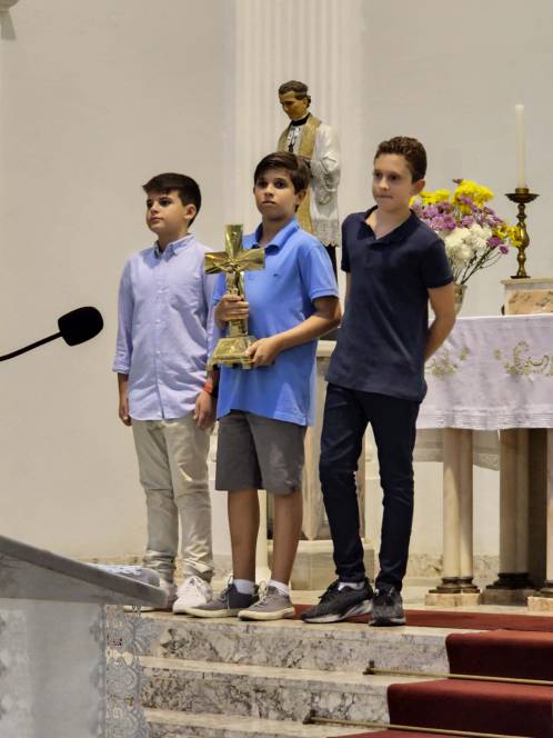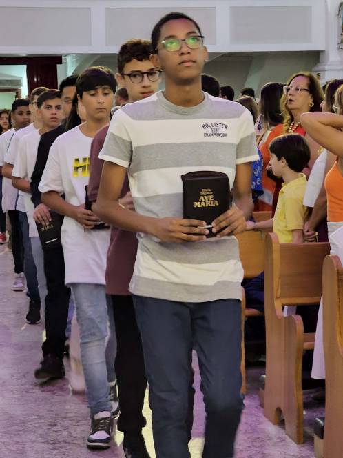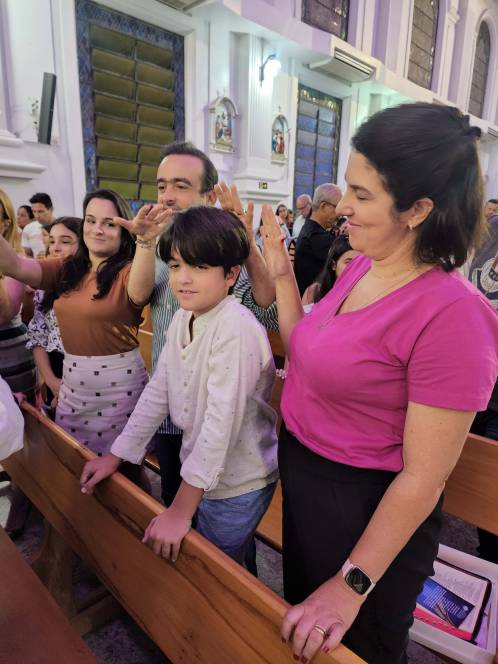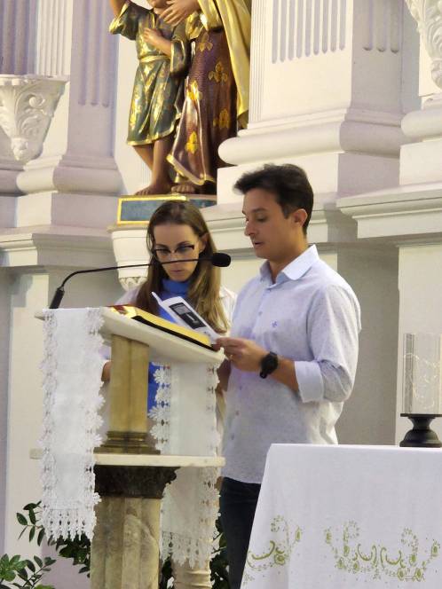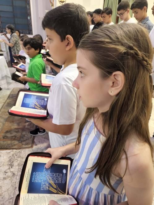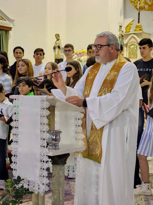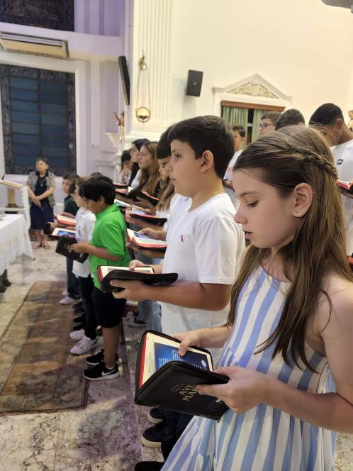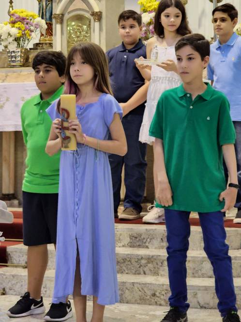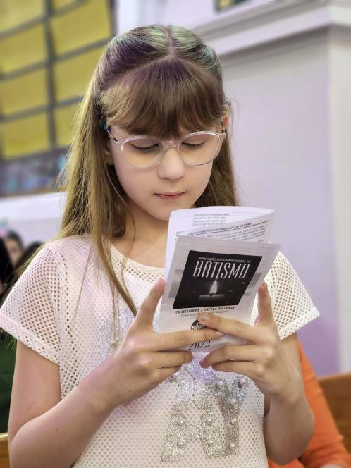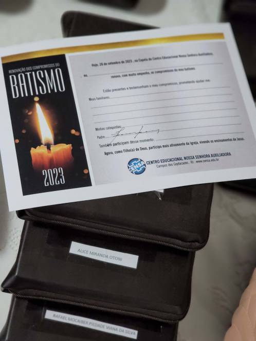 Dando mais um importante passo para a Primeira Eucaristia, os 98 alunos do CENSA que esse ano receberão o sacramento participaram da Renovação das Promessas do Batismo. A celebração aconteceu na noite de terça-feira, 26/09, na capela da escola. Diante dos pais e padrinhos, os jovens confirmaram pessoalmente o desejo de seguir a Jesus, ser cristãos de verdade e viver na família de Deus.