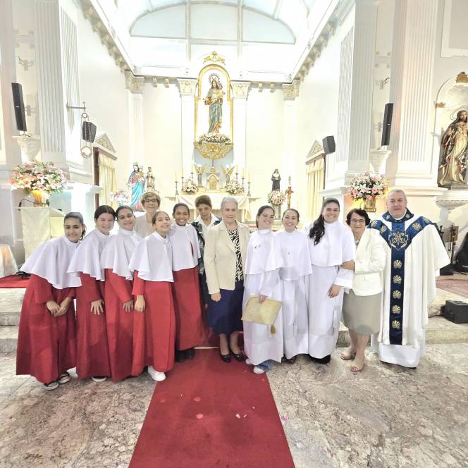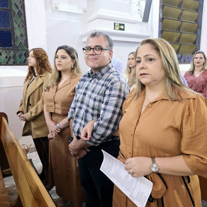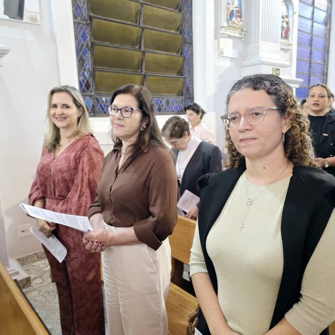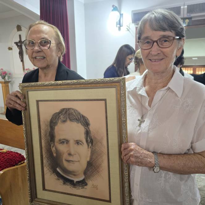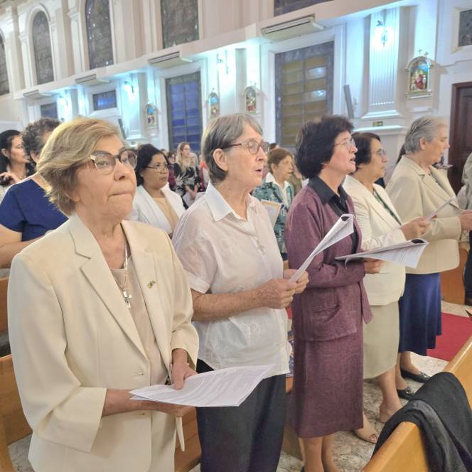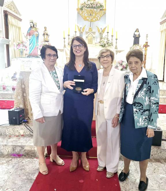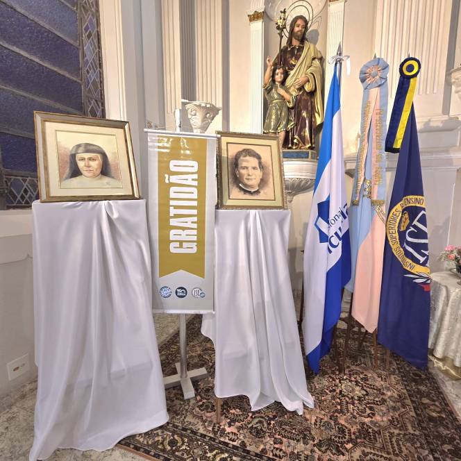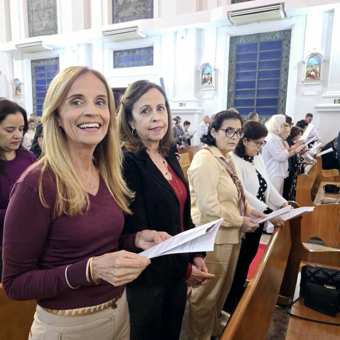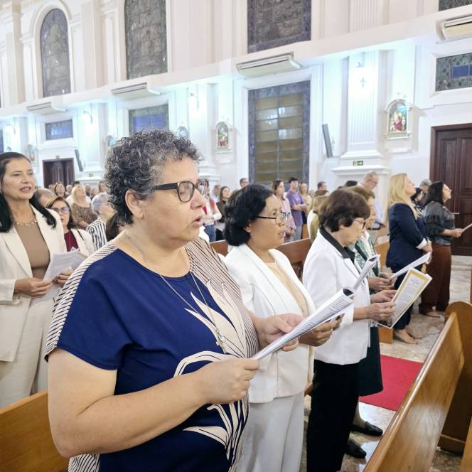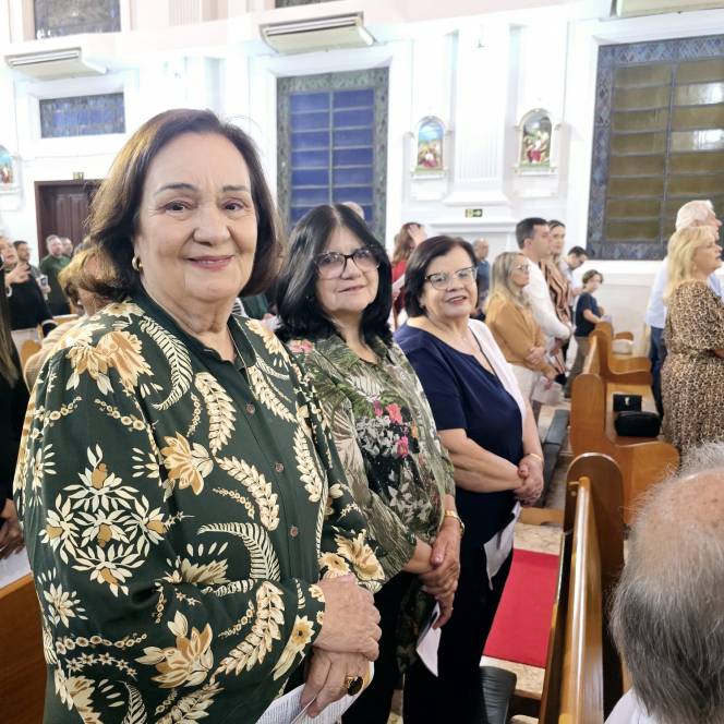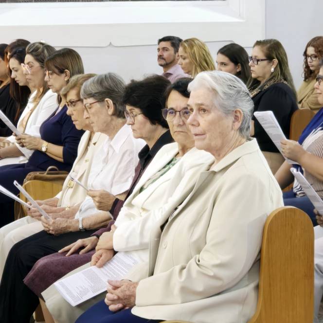 O CENSA realizou uma Missa em Ação de Graças pelo seu centenário, no sábado, 24 de maio. Além das Irmãs e do corpo docente e administrativo da casa, a celebração reuniu, também, ex-alunos, ex-professores, ex- funcionários e os presidentes da APPCENSA e da UESC ao longo desses anos. A coroação de Nossa Senhora, habitualmente realizada por alunos, desta vez teve à frente a Inspetora Ir. Teresinha Ambrosim, a diretora geral. Ir. Ana Teresa Pinto, a diretora acadêmica Ir. Luzia Alves de Carvalho e a tesoureira Ir. Aparecida Ferreira que, ao final, comandaram um vigoroso coral do hino das FMA, "Oh Qual Sorte!" A noite contou ainda com homenagens àqueles que fizeram e fazem parte dessa casa, dedicando seu trabalho e amor à missão salesiana. Muita emoção, reencontros e gratidão. Que venham mais 100 anos!